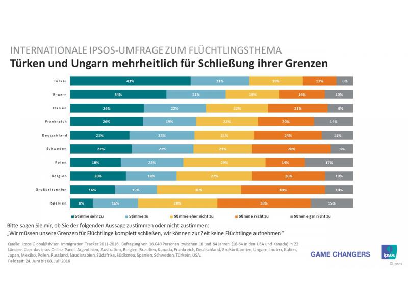 Die größte Furcht vor als Flüchtlinge getarnte Terroristen haben im internationalen Vergleich mit 83 Prozent die Menschen in der Türkei. Auch in Russland und Ungarn ist diese Befürchtung groß (77% und 72%). In Europa kennt man lediglich in Spanien solche Ängste kaum. Gerade einmal jeder sechste Spanier befürchtet Terroristen unter den Flüchtlingen (16%).